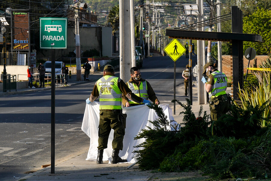 <![CDATA[Una persecución policial terminó de la peor manera. El conductor de un vehículo recién robado escapó por la zona urbana de la comuna de Limache, y en el sector Palmina Romano Sur, se estrelló contra un grupo de peatones que estaban esperando locomoción colectiva en un paradero de la zona. Producto de esta violenta situación, una mujer perdió la vida en el lugar y otra persona resultó gravemente herida.